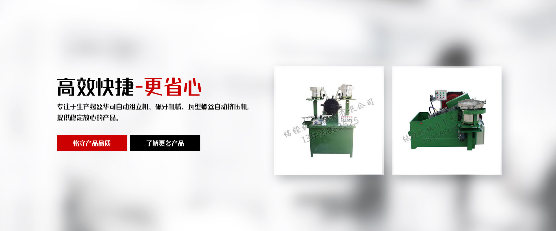 銘鏜機械五金有限公司,位于浙南地區(qū)經(jīng)濟繁榮發(fā)達的樂清白象鎮(zhèn)工業(yè)園區(qū)。公司擁有多年生產(chǎn)螺絲華司自動組立機及碾牙機械,瓦型螺絲自動擠壓機,制造和生產(chǎn)經(jīng)驗。公司成立至今以先進的技術完善的科學管理、嚴格的產(chǎn)品檢測及質量保證體系、和完善的售后服務體系;贏得廣大用戶的好評和信賴。